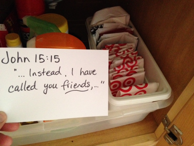 He exchanges my hands folding plastic for my hands folding in prayer. And He and I are blessed with just a bit more growth in our friendship.
